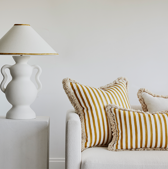 Lucy Montgomery’s striped cushions channel the Collection’s Mediterranean influence. The range uses a signature fabric which has been custom designed with bespoke painted stripe and printed on premium Belgian linen (245gsm). This luxurious and durable fabric is made from the finest linen yarns and ages beautifully. Each cushion includes a premium feather-down insert and is handmade in Australia.