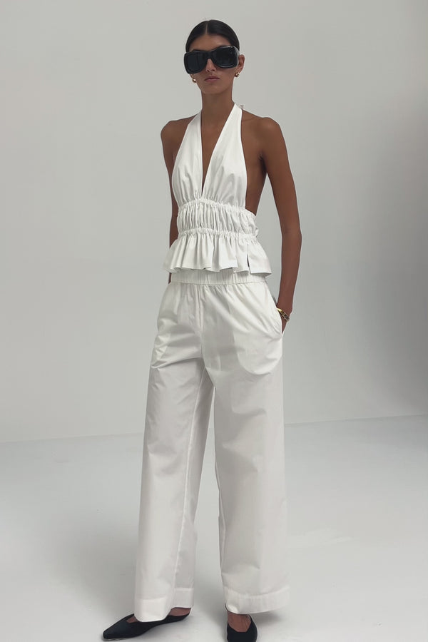 The Cotton Poplin Halter Top in White is light and easy to wear. With gathered detailing and an open back, it’s made for warm days and nights alike. Style it with denim, pair it with the matching poplin pant, or add a mini and heels when the mood shifts.