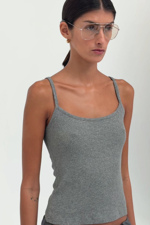 The Dropshoulder Cashmere Cardigan in Chocolate Marl is a relaxed knit crafted from soft cashmere. Designed with a crew neckline and dropped shoulders, it’s finished with ribbed trims and mother-of-pearl button closures for a refined finish. Wear it buttoned as a top, layered over a tank, or styled with the matching cashmere tank.