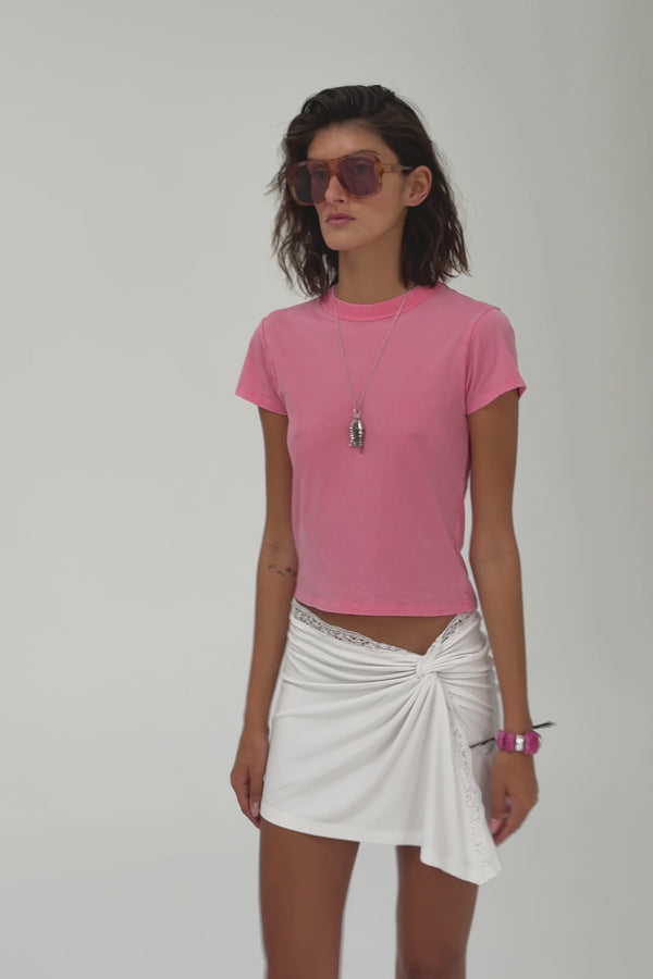The Track Jersey Mini Skirt in Burgundy and Off White is a sporty micro mini cut from stretch textured jersey. Designed to sit low on the hips, it’s finished with contrast trim and a ribbed waistband. A playful option for throwing on between swims or when the plan is loose and the day is long.