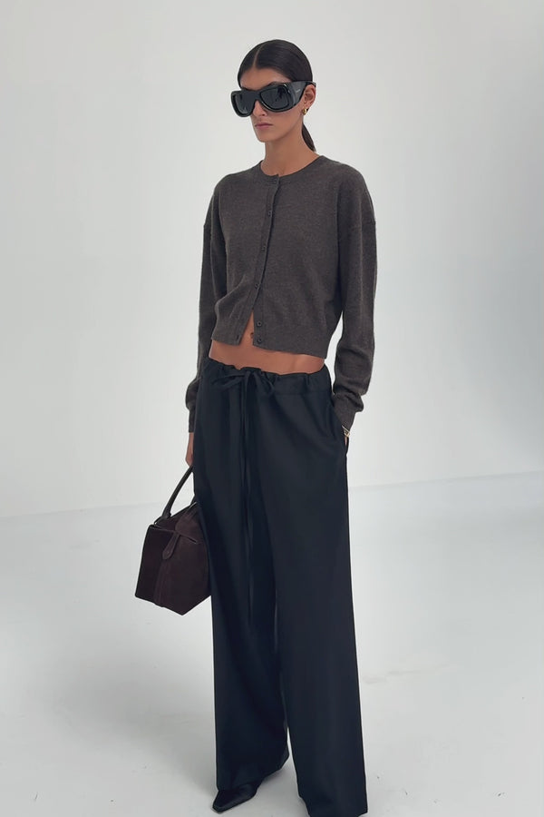The Wool Paperbag Pant in Black is a relaxed tailored style cut from breathable wool suiting. Designed with an adjustable drawcord waistband for a custom fit, it features soft gathering along the waist, a wide leg silhouette, and practical side pockets. Effortless and versatile, it can be dressed up with a heel or pared back with a sandal.